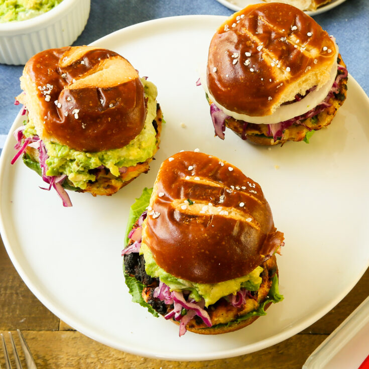 Serve the burgers on buns of your choice, topped with a small amount of the remaining honey-mustard, greens, mashed avocado, onion and slaw.